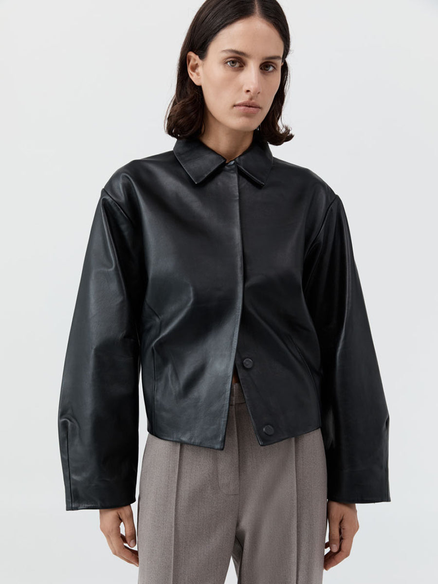 The Cocoon Leather Jacket in black from St. Agni features a structured cocoon silhouette, a pointed collar, concealed magnetic buttons, and front and back darts for a shaping fit. This versatile jacket is an absolute must-have in any wardrobe. Thanks to its slightly looser fit due to the cocoon shape, it can be perfectly layered over light puffer jackets, even in colder weather.